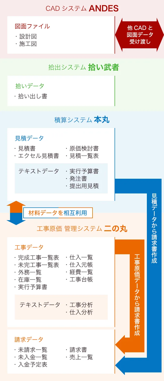 設備工事業者様の日常業務をシステム化し、現在の状況・書類を一元管理します。また、転記作業を減らすことで重大な損失にもつながる転記ミスを減らし、業務を効率化させます。システムを組み合わせて利用することで、「情報の共有」と「見える化」を実現し、日常業務のムダを減らし、生産性・収益率の向上を目指せます。